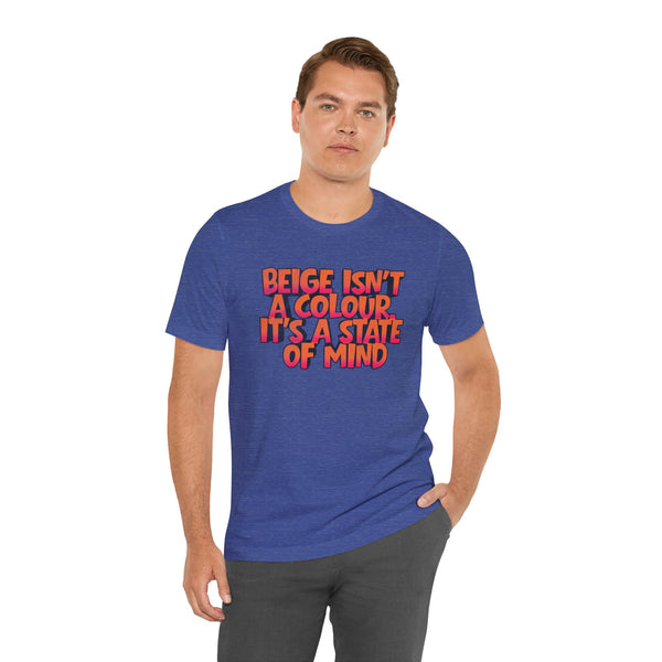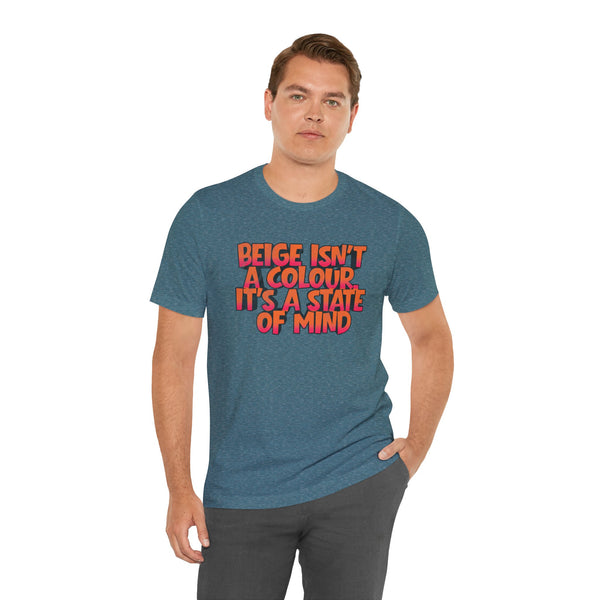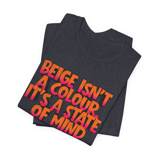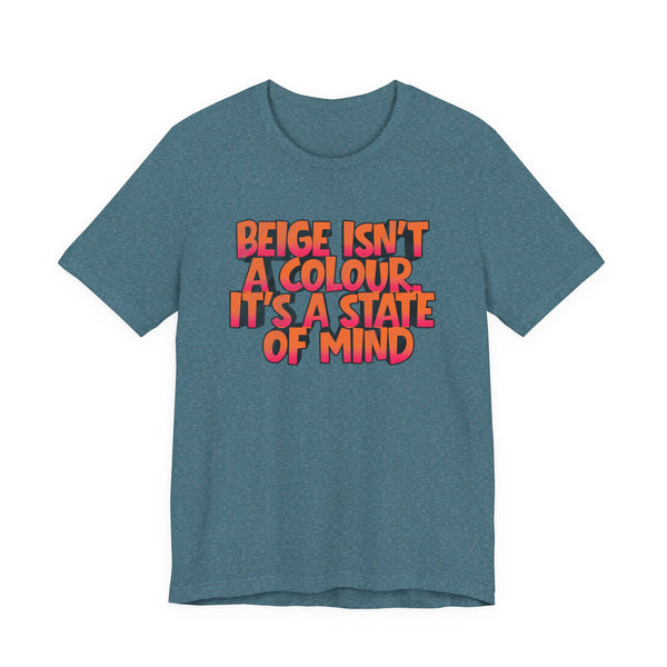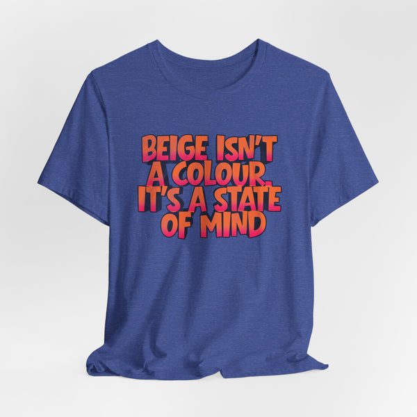 Beige isn’t a colour. It’s a state of mind. This T-shirt is for those who refuse to fade quietly into the background. It’s a playful but pointed statement for anyone who knows that colour is not just decoration – it’s attitude. A reminder that playing it safe often looks neutral, and that choosing colour is often the braver option. Bold, comfortable, and unapologetic, this tee is made for everyday wear with a little extra meaning. Whether you’re creating, working, or simply living out loud, this shirt says what you’re already thinking. Beige is safe. Colour is a choice. This lightweight tee speaks with a wink: bold, retro lettering reads “BEIGE ISN’T A COLOUR, IT’S A STATE OF MIND,” so you can wear your dry humor where it’s seen. The soft, airy cotton feels cool against the skin and layers easily under a jacket or over a long sleeve. Built with thoughtful details — ribbed collar, shoulder tape and side seams — it keeps a neat shape through repeated wear. The vibrant sleeve and label printing techniques give the design a crisp, dimensional look that pops against heathered fabric. It’s the kind of shirt that slips into everyday life: brunch banter, commute conversations, or a relaxed night out when you want to say something without saying too much. Product features - 100% Airlume combed and ring-spun cotton (lightweight 4.2 oz) — breathable and soft - Ribbed knit collar with seam and shoulder tape for shape retention and durability - Side seams for better structure and longer-lasting fit - Crisp, vibrant prints (DTF/DTG depending on provider) on sleeve and neck label - Tear-away label and REACH certified; sourced from Bella+Canvas with ethical manufacturing Care instructions - Machine wash: cold (max 30C or 90F) - Non-chlorine: bleach as needed - Tumble dry: low heat - Iron, steam or dry: medium heat - Do not dryclean