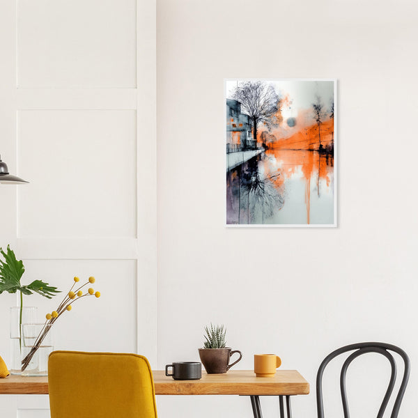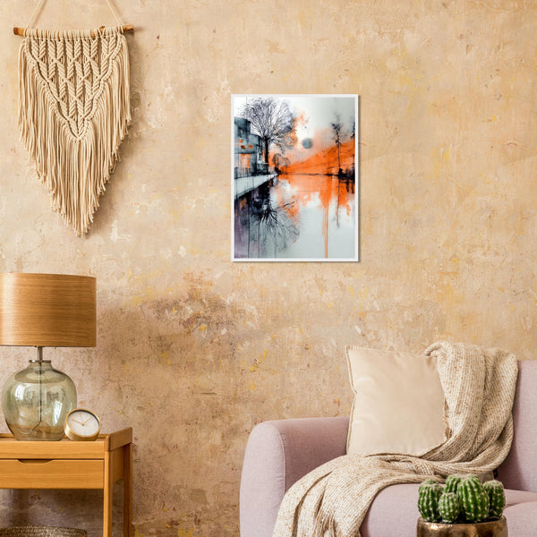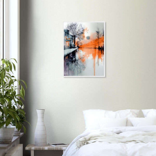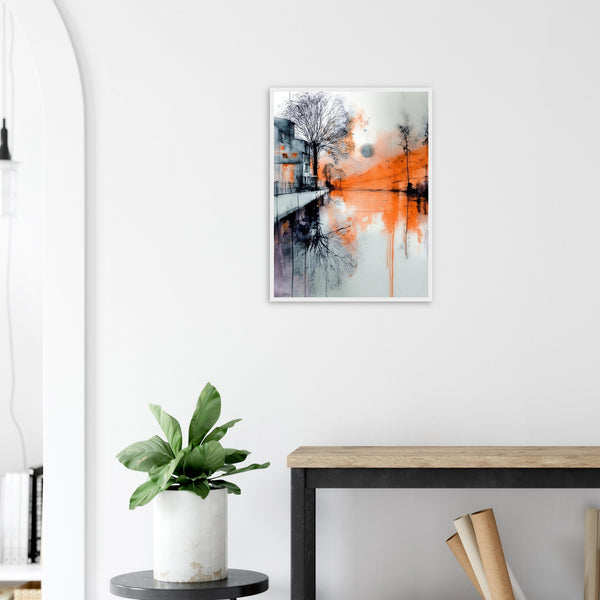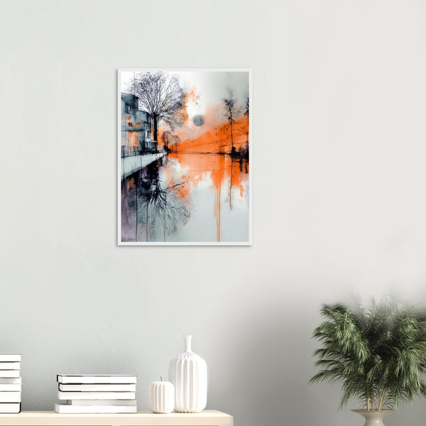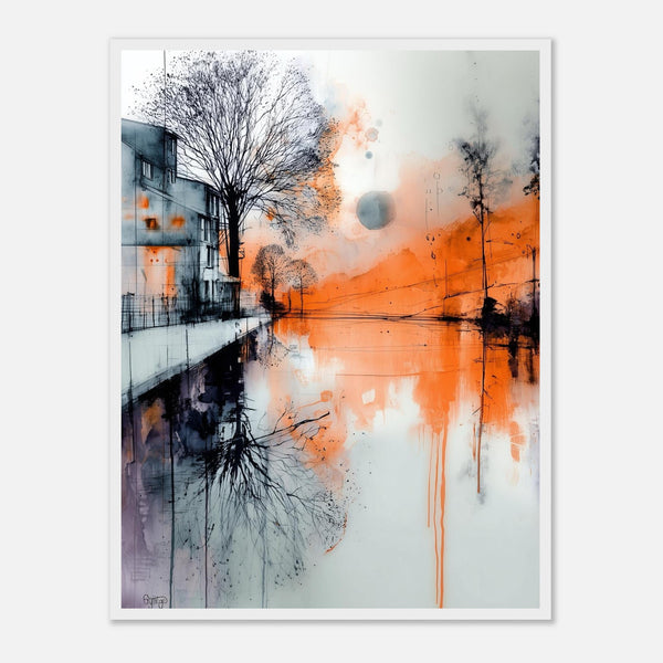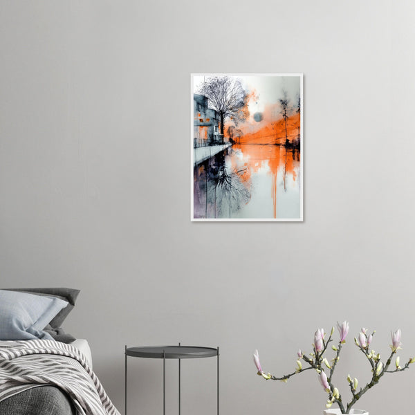 Byens linjer speiler seg i vannet, mens himmelens oransje glød minner oss om alt som er i ferd med å forsvinne – og alt som ennå lever i refleksjonen.